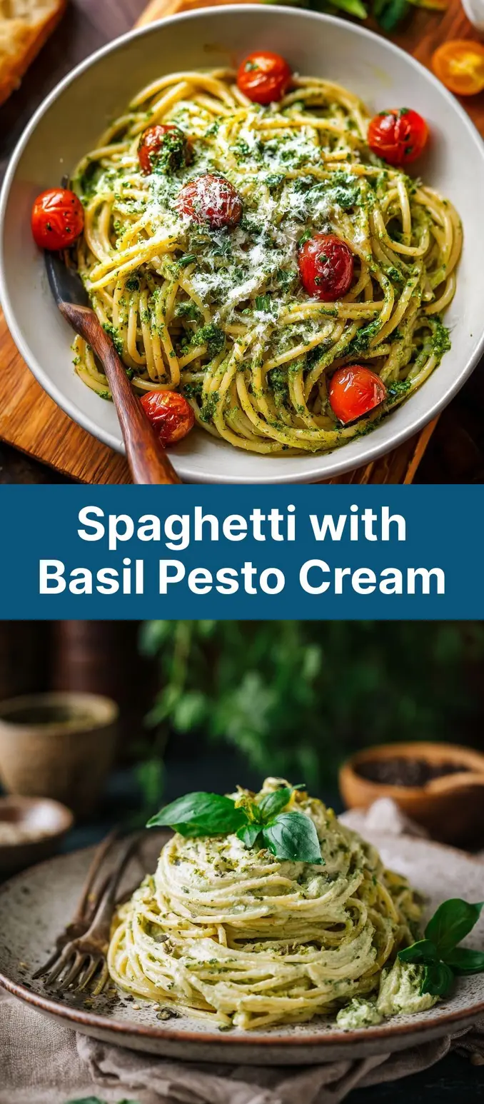 Spaghetti with Basil Pesto Cream is a sumptuous, aromatic dish that blends the freshness of homemade pesto with the indulgent silkiness of a cream-based sauce. Easy to customize and perfect for any occasion, it brings the essence of Italian cuisine to your table with elegance and flavor.